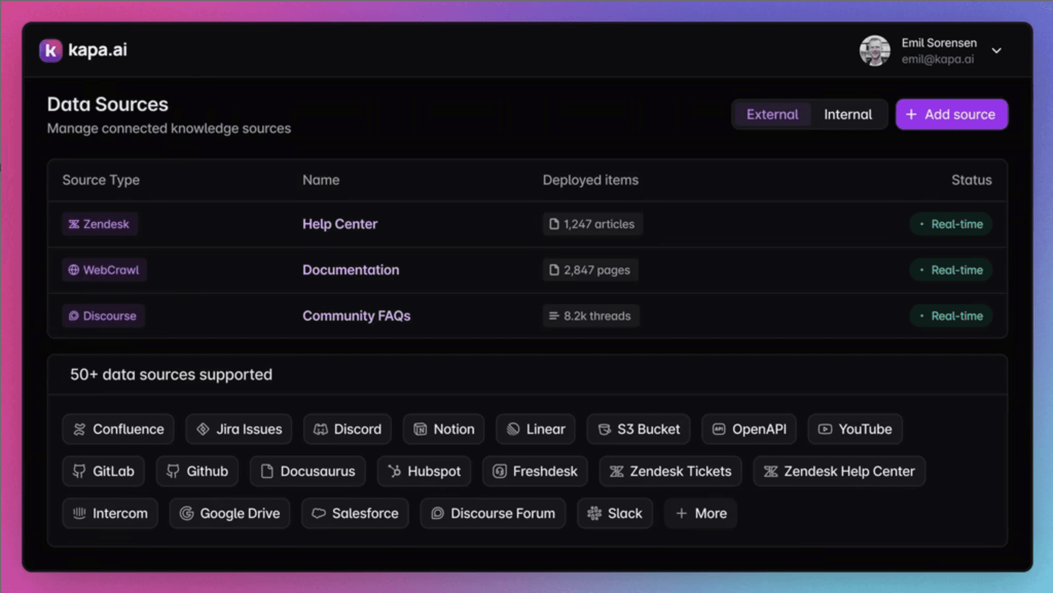 As we’ve seen with common pain points, opting for a solution like Kapa simply makes sense. There will be no need to create anything from scratch: connect your data sources, deploy it, and you’re ready to go.