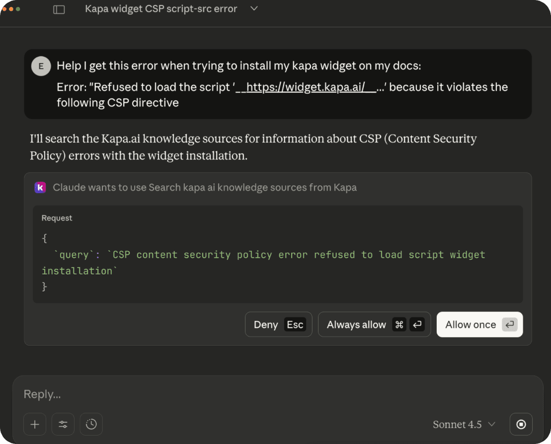 With your Kapa MCP, they just ask their AI coding assistant. Behind the scenes, it queries your knowledge base and returns grounded, cited answers. No context switch. No guesswork.
