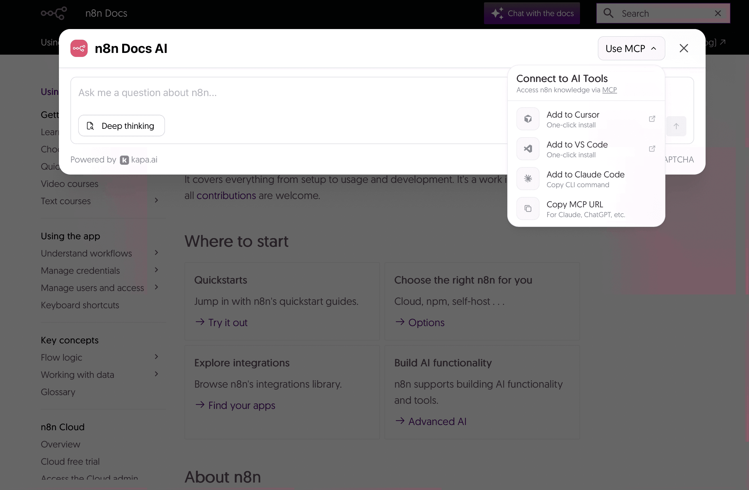 n8n’s Ask AI widget allowing one click connection to their documentation MCP server
