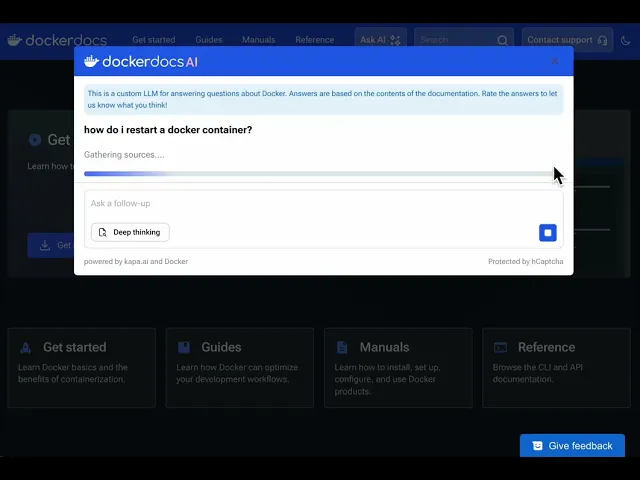 This tends to be where most teams start. The main documentation stays the same but now there's a chat box layered on top. With tools like Docker Docs, developers can get help right when they need it. Rather than having you scroll through menus or type into a search bar, the system grabs responses straight from existing static information.