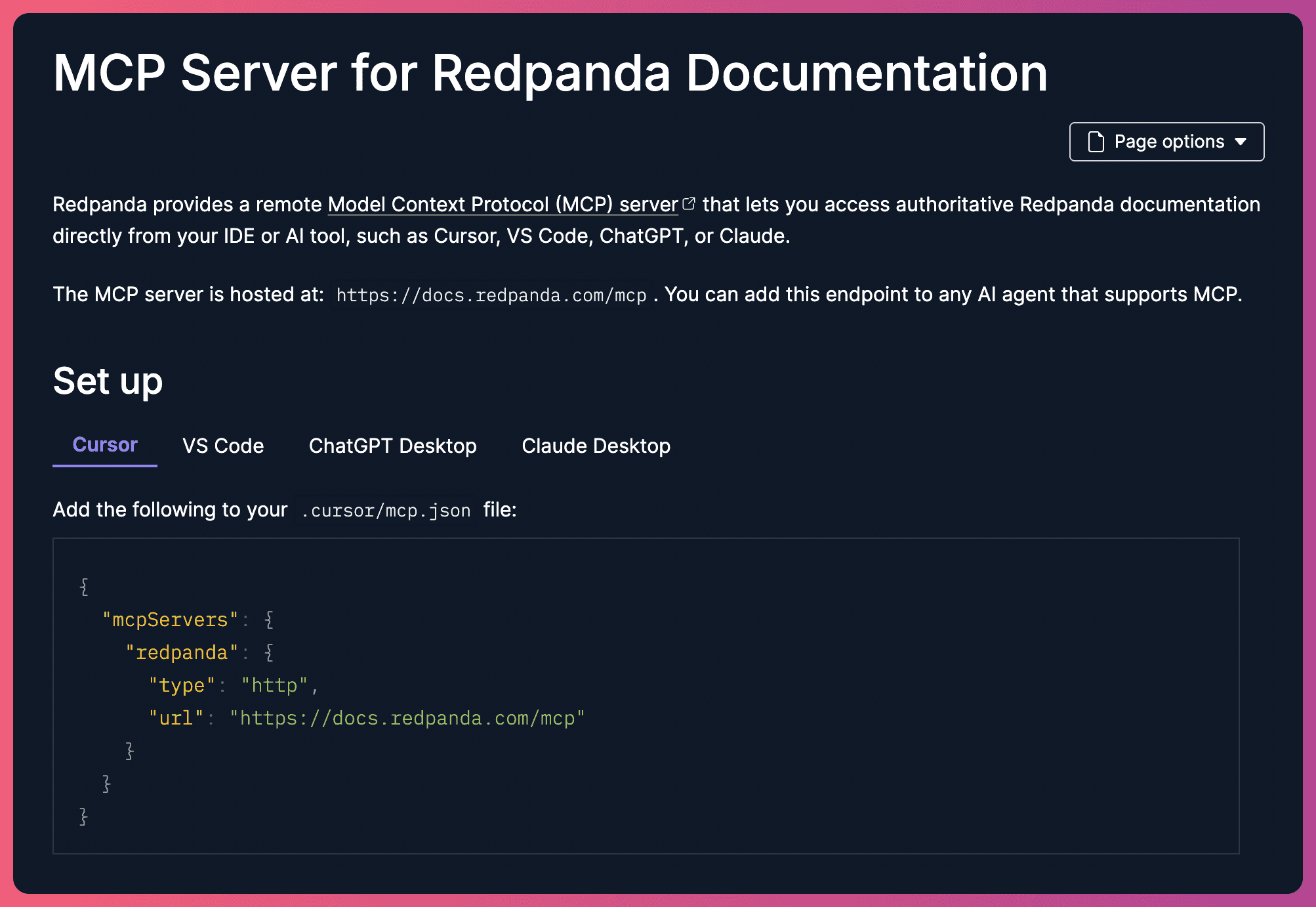 Redpanda is a great example here. They built a dedicated MCP setup page in their docs with tool-by-tool instructions, example prompts tailored to their product, and troubleshooting tips. It's thorough, easy to scan, and gives developers everything they need to go from zero to connected in a couple of minutes.