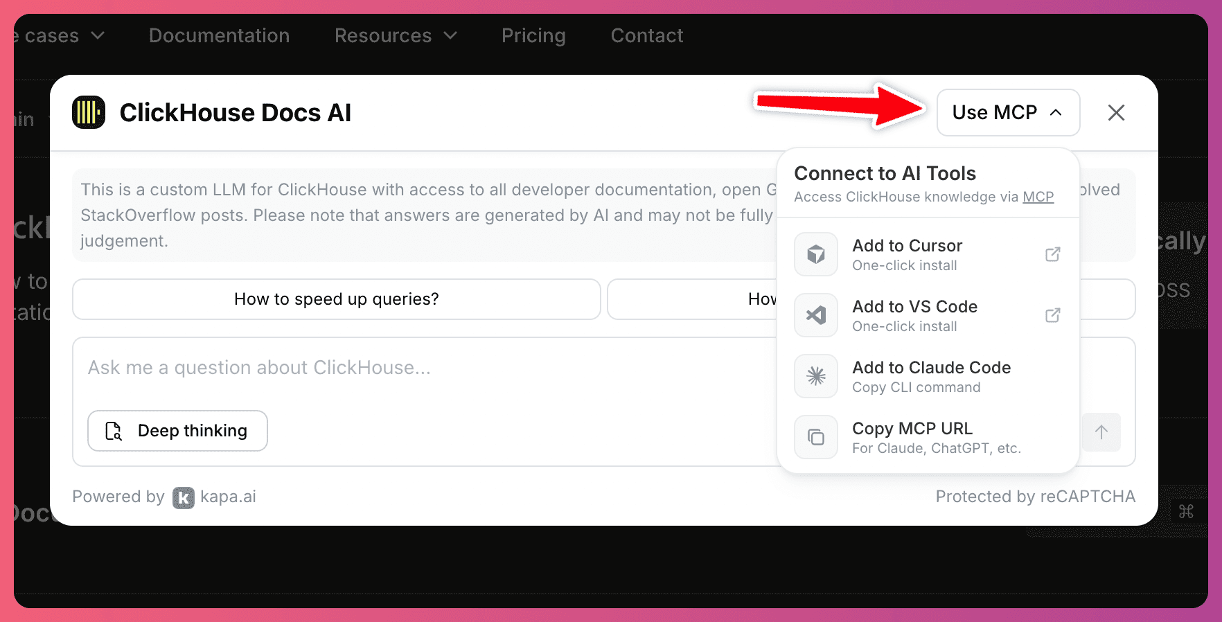 Kapa's widget includes a built-in MCP install menu that you can enable with just two attributes on your widget script tag: data-mcp-enabled="true" and data-mcp-server-url. Once enabled, a dropdown appears in the widget header giving your users one-click install options for Cursor and VS Code, a copy-paste CLI command for Claude Code, and the raw MCP URL for use with Claude Desktop, ChatGPT, or any other MCP-compatible tool. Take it for a spin on the docs of, for example, ClickHouse, n8n, and Temporal.