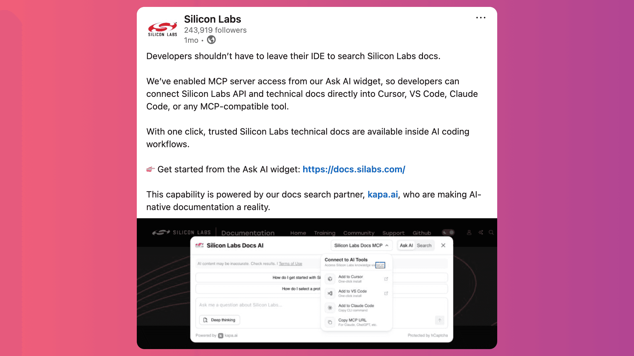 Post it on social media. A short post on X/Twitter, LinkedIn, or your community Discord/Slack goes a long way - check out how Silicon Labs did it. Developers share tools that make their lives easier, and an MCP server is exactly the kind of thing that gets retweeted. Keep it simple: a one-liner about what it does, a screenshot or GIF of it in action inside an IDE, and a link to your setup page. Bonus points if your DevRel team or engineers post from their personal accounts - developer-to-developer recommendations carry more weight than brand accounts.