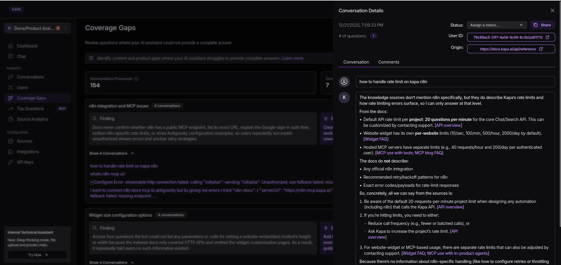Also, you are able to see in which conversation the gap occurred, with the full conversation transcript, sources Kapa used, and a few other neat details.