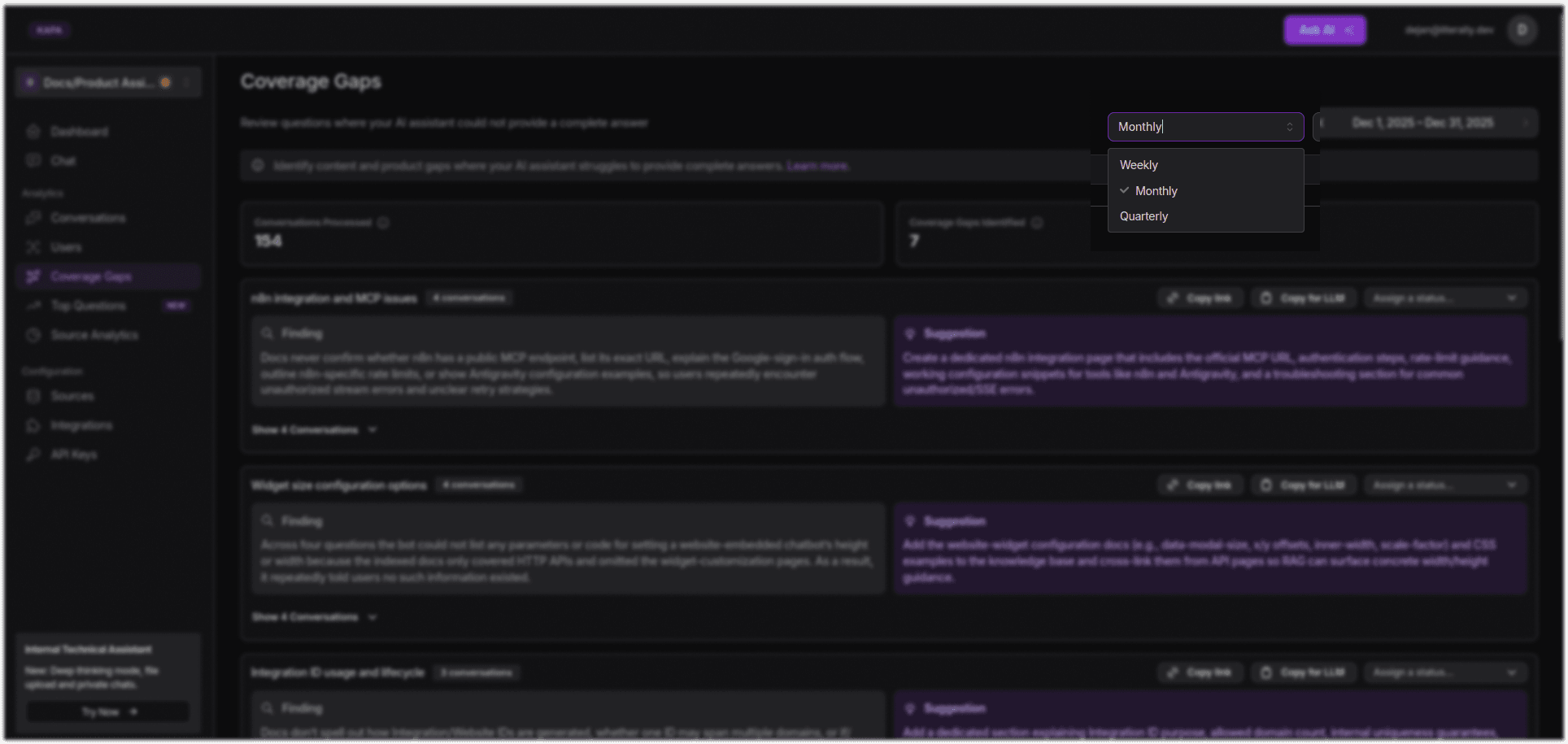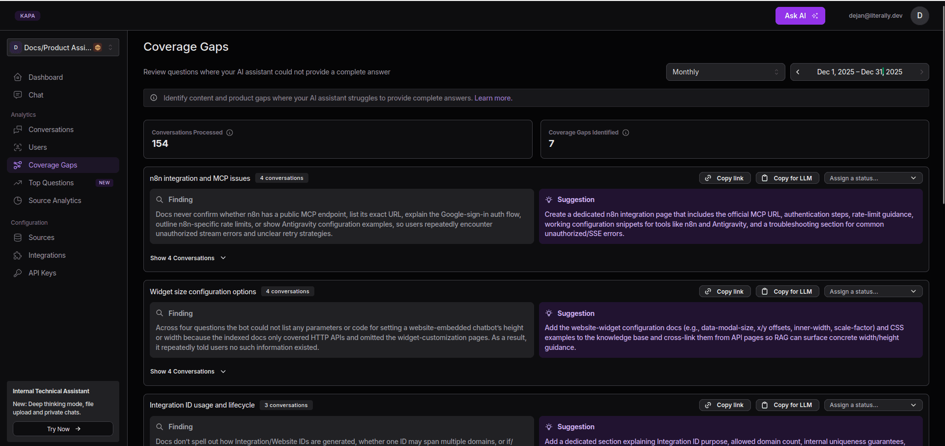 Adding the Ask AI feature to all relevant sites makes it easier to find content gaps effectively. For example, when users ask questions about topics that are inadequately documented, Kapa will respond with some version of “I don’t know.” Within the Kapa platform (app.kapa.ai), all “uncertain” conversations are automatically analyzed and clustered into specific insights and actionable recommendations, with a convenient “copy” functionality to make acting on them even easier.