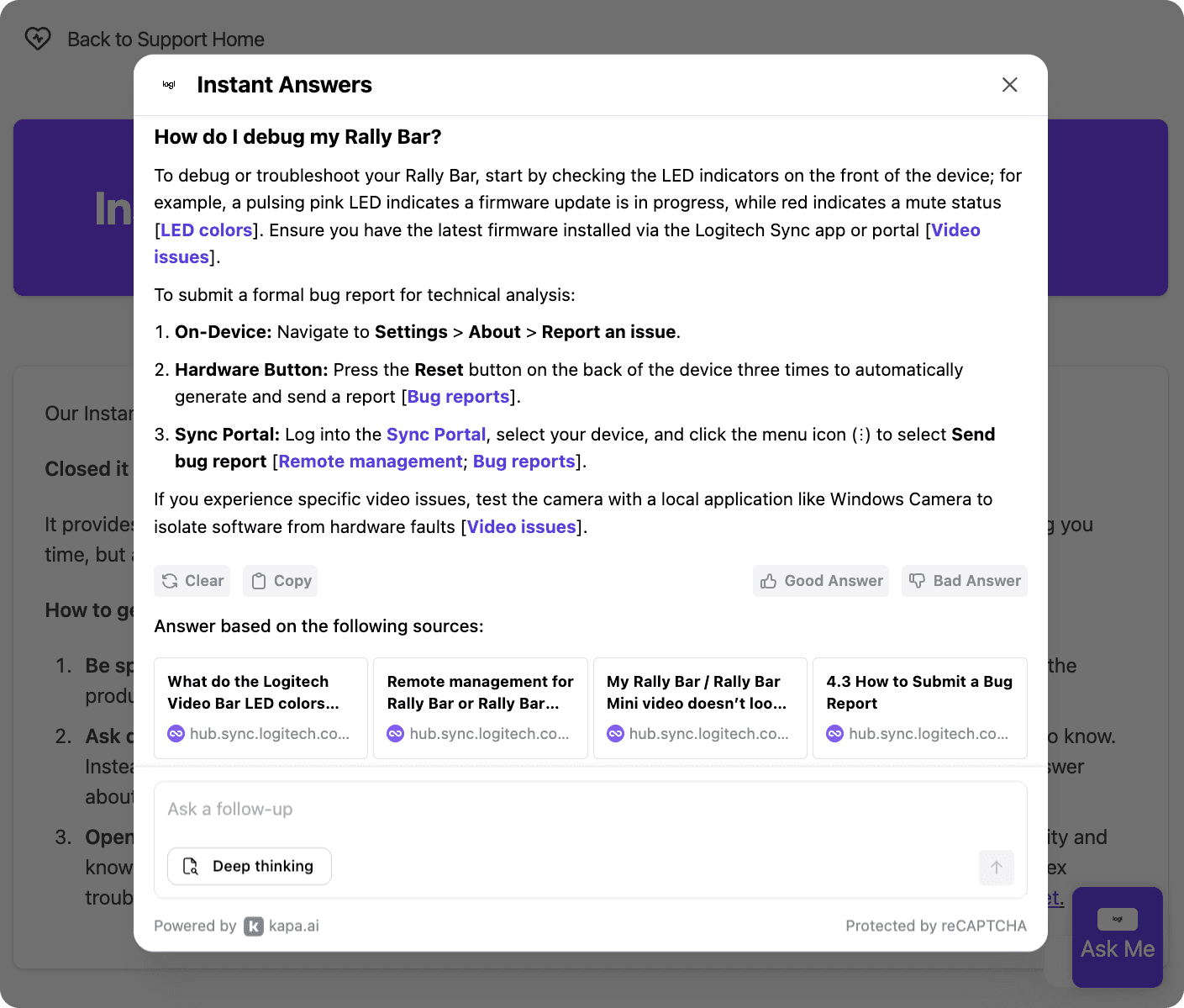 Because Kapa only answers from Logitech's own content and clearly indicates when it's uncertain, the team trusted it enough to put it directly in front of customers.