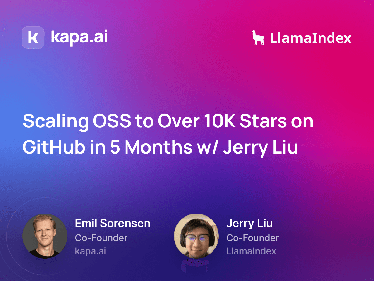 Hey everyone! Welcome to the 5th episode of the kapa.ai podcast. In this exciting episode, we chat with Jerry Liu, the creator of the rapidly growing LlamaIndex project. We discuss the incredible growth of the project, the transition to working on it full-time, and the various design principles and features that make LlamaIndex stand out.