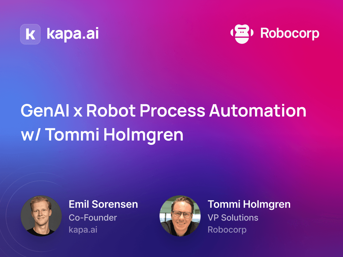 Welcome to the kapa.ai podcast! In this episode, we are excited to have Tommi Holmgren, VP of Solutions at Robocorp, joining us to discuss the intersection of GenAI and Robotic Process Automation (RPA). Tune in to learn about the future of RPA, the importance of community, and how Robocorp is helping to shape the industry.