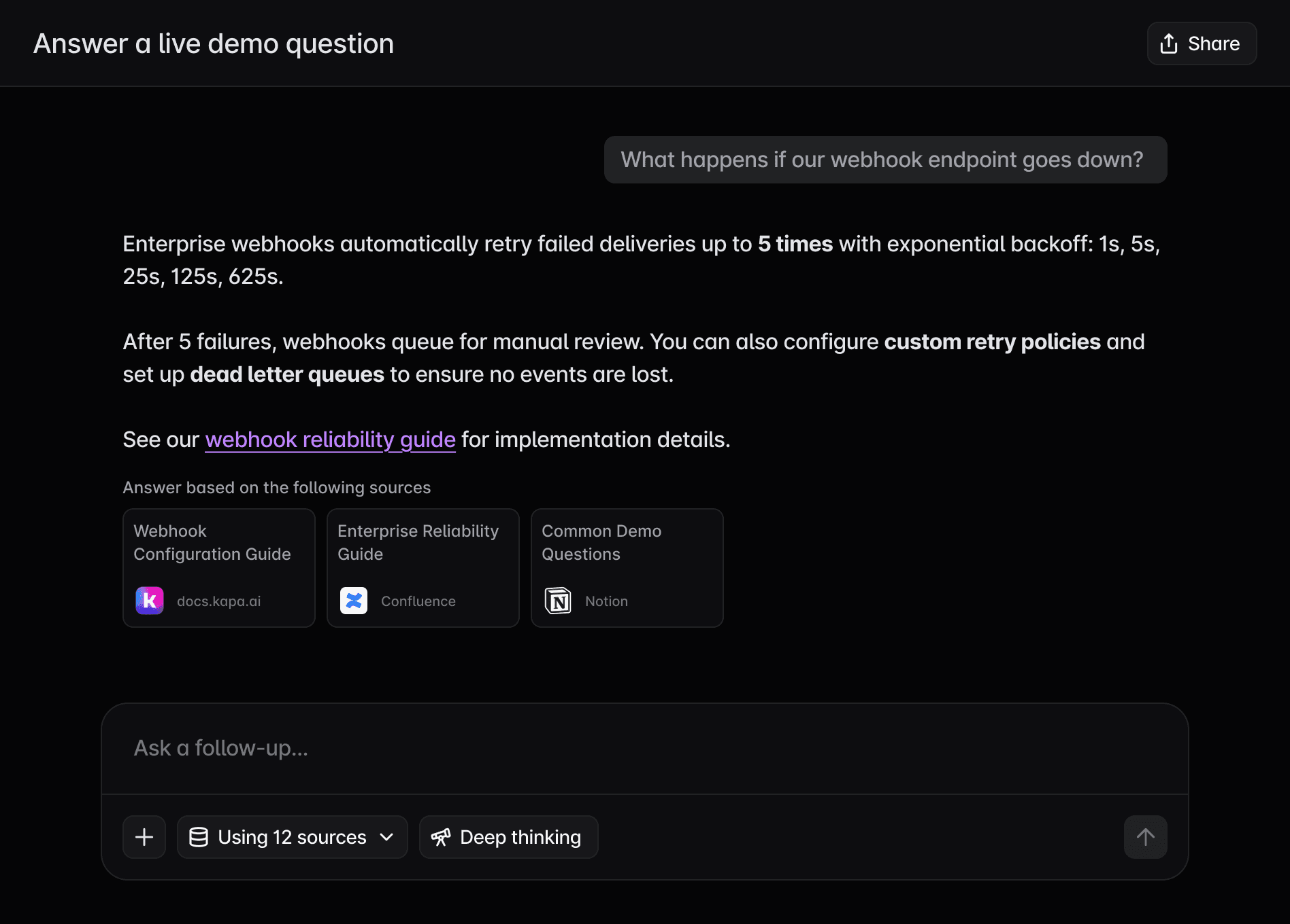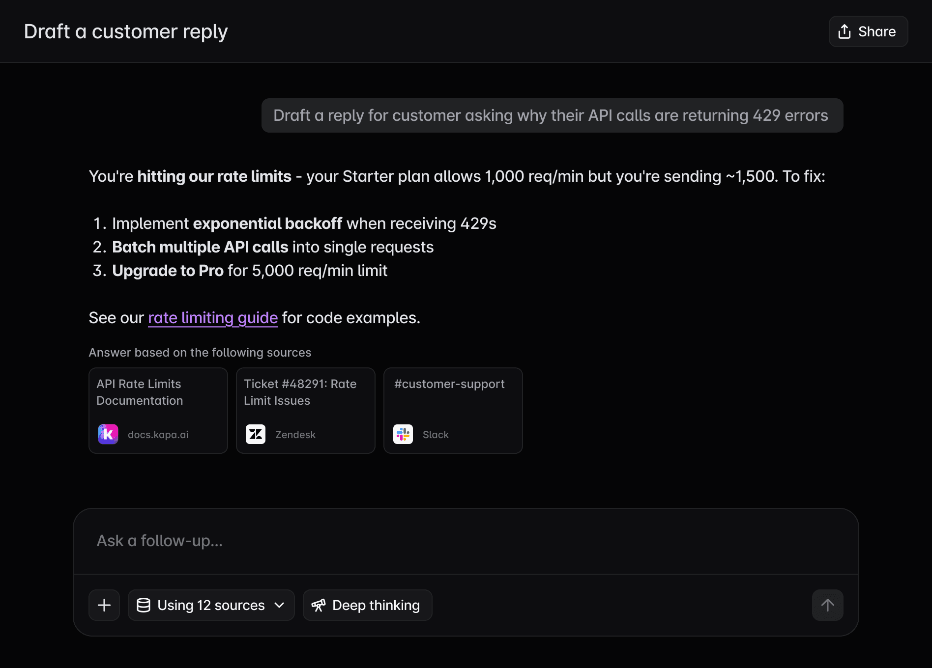 Kapa learns your product inside-out by connecting your docs, Slack, Confluence, and support tickets. Get accurate and grounded answers - not generic AI hallucinations.